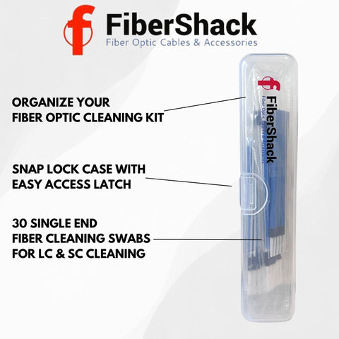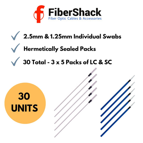 FiberShack Fiber Optic Cleaning Sticks - 30 pack - 15 Packs of 2.5mm SC/ST/FC/ST Cleaning Sticks & 15 Packs of LC/MU Cleaning Swabs - in a Snap lock container